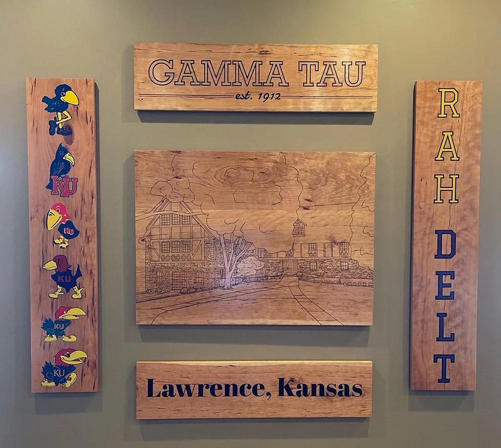 This is a group of work that we completed for a fraternity’s rec-room wall. Wood-burned and screen-printed on cherry wood. The middle piece is 27” x 37.” top and bottom pieces are 27” x 10.” Left and right pieces are 48” x 9.”