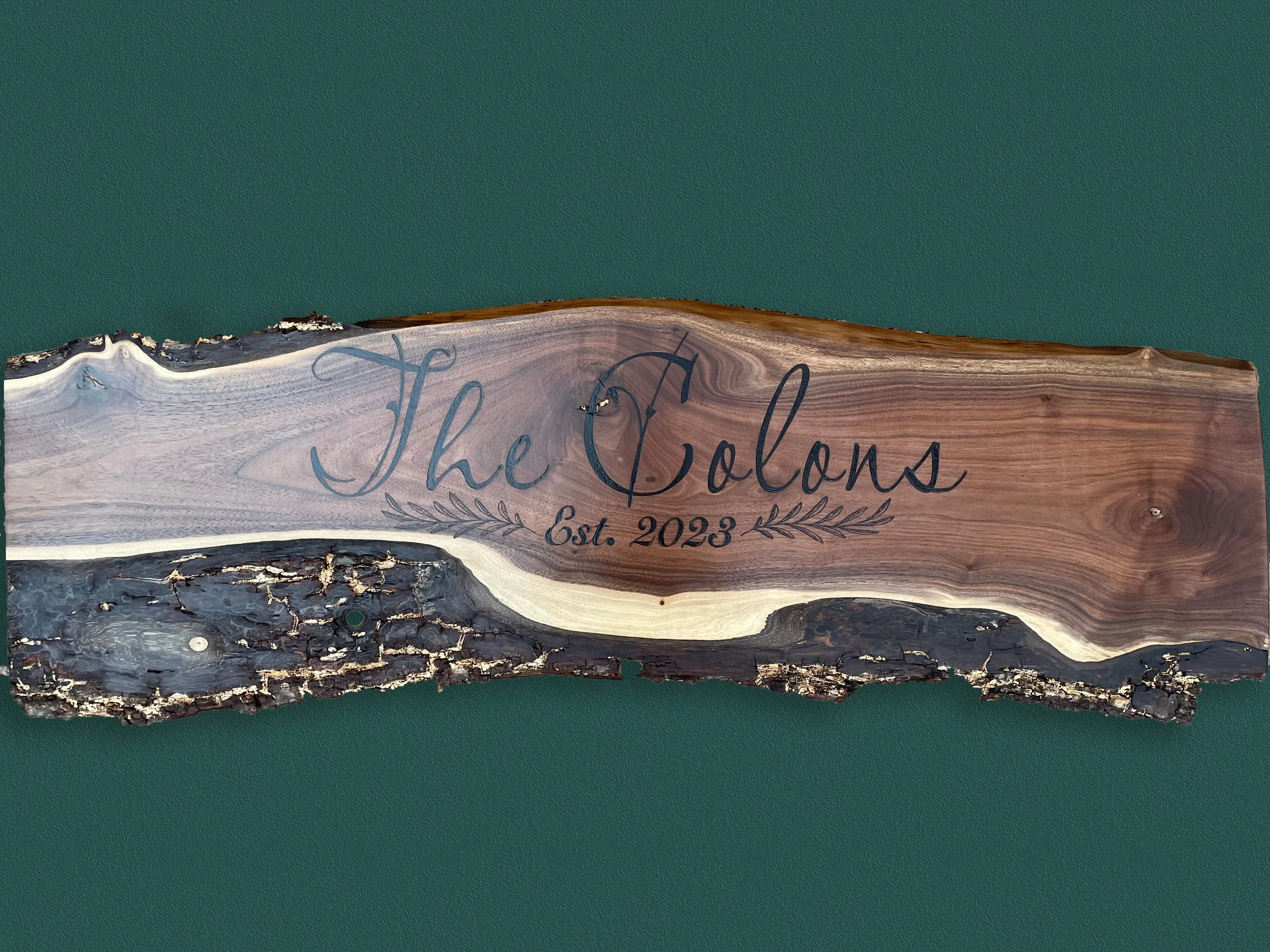 Wedding sign on live edge walnut. Wood-burned and gold leaf. about 48” in width