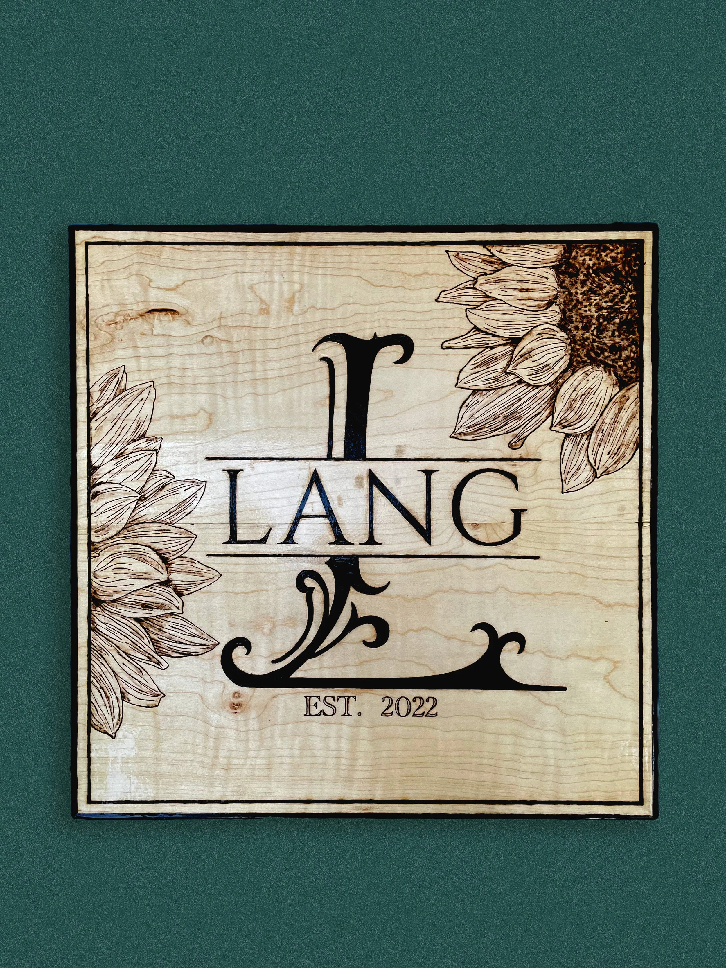 A Wedding gift wood-burned on Curly Maple 14'“ x 14”